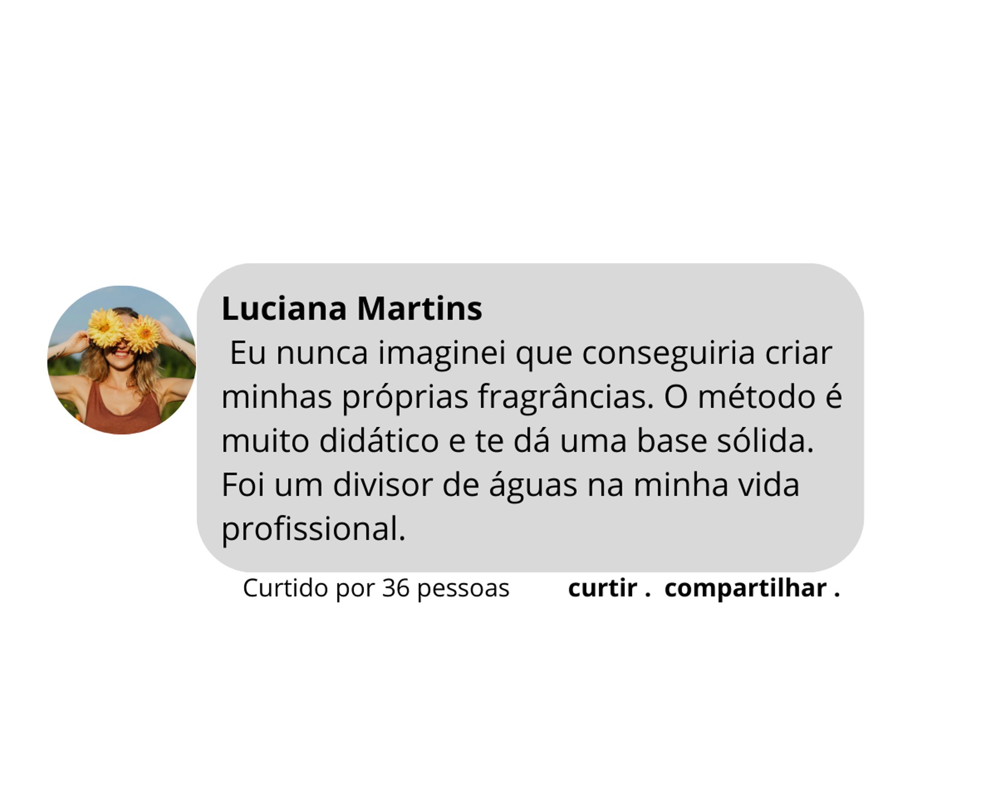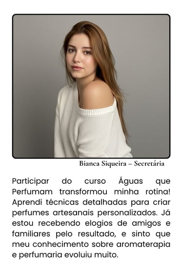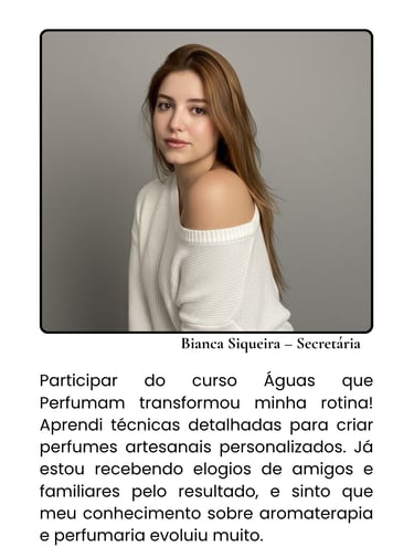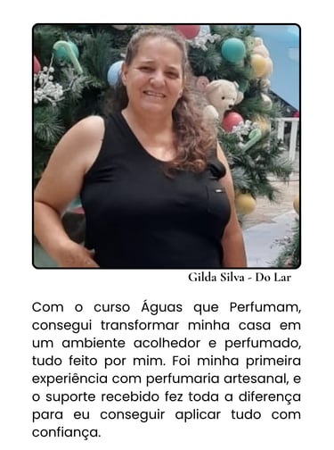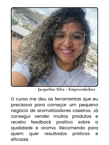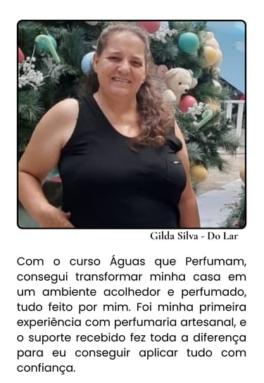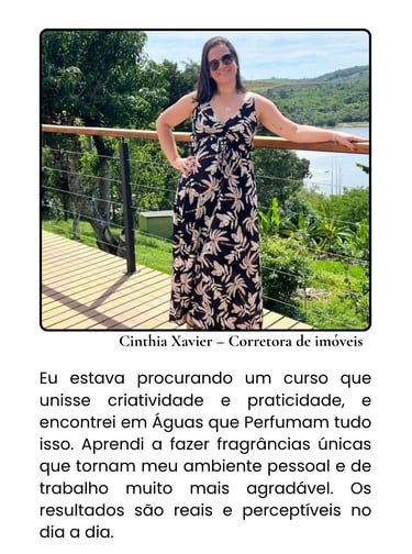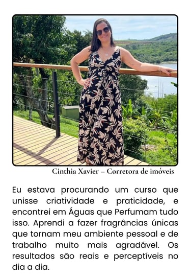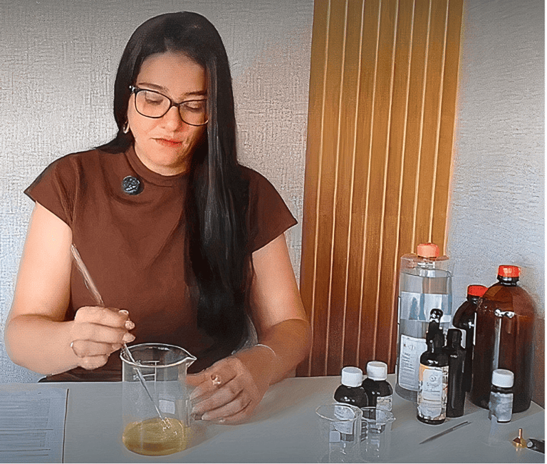 Desde então, desenvolvi um processo capaz de transformar qualquer pessoa, mesmo sem experiência, em criadora de fragrâncias únicas, cheias de memória, propósito e desejo — com técnicas como o layering, que dá personalidade e impacto real às criações.