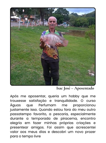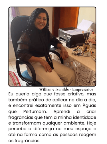 Hoje, ensino diversas pessoas a criarem seus próprios perfumes e produtos perfumados, começando da cozinha de casa, sem fórmulas engessadas e com grandes chances de transformar tudo isso em renda. Minha missão é levar a Chave de ouro para quem quer fazer do aroma um novo começo: mais autêntico, mais sensorial, mais seu!